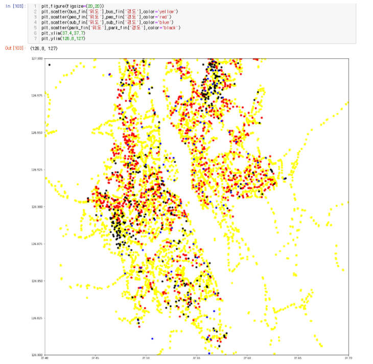 아래는 과거 데이터 분석 프로젝트 도중 서울시 지하철, 버스 정류소 위치를 scatter plot에 나타낸 결과 입니다.